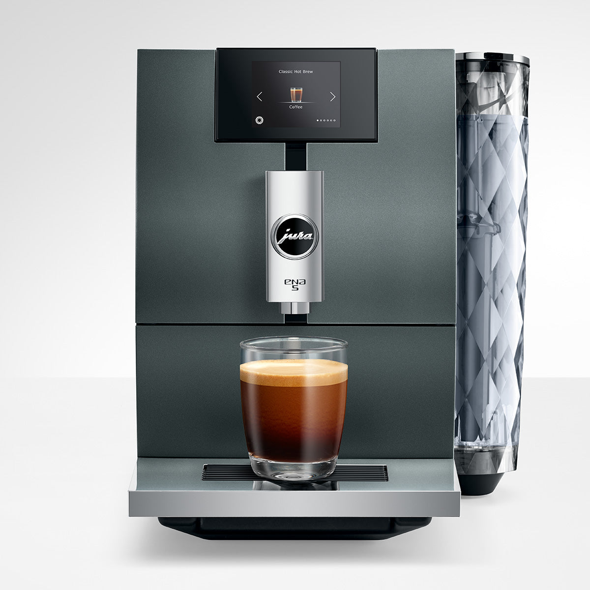 ENA 5 utmerker seg med kompaktklassens høye standard og de innovative teknologiene fra JURA. Den presenterer seg som en Coffee-only-kaffemaskin som oppfyller forkjærligheten for det spesielle. På TFT-berøringsskjermen viser ENA 5 de tre traktevariantene med ulike bakgrunnsfarger og fører kaffeelskere tydelig og enkelt gjennom menyen. De runde designdetaljene på huset, kombinert med det rettlinjede formspråket, vekker oppmerksomhet. Iøynefallende er også vanntanken med det store diamantmønsteret og det forkrommede kaffeutløpet.