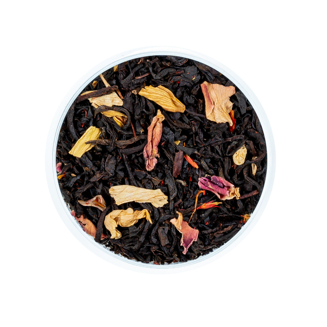 Morgenrøden inspirerer. Blomster som springer ut. Herlig duft. En fin blanding av sort te fra Kina, Ceylon og Vietnam, tilsatt smak av pasjonsfrukt, kronblader fra fargetistel, roser og solsikker, samt lime-olje.